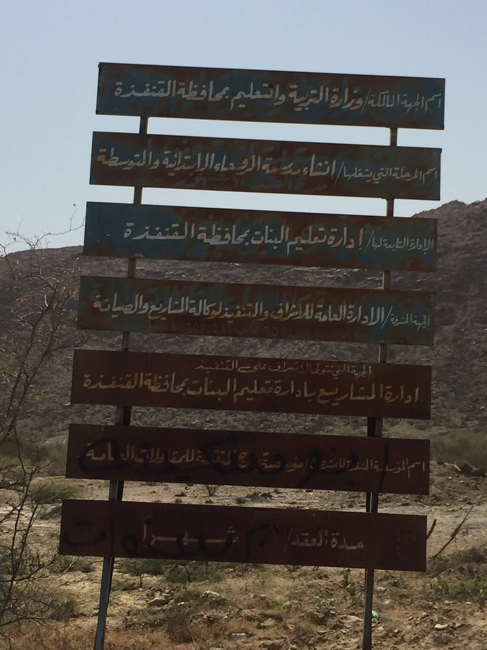 كما كُتب أيضًا على نفس اللوحة الإدارة التابعة لها : إدارة تعليم البنات بمحافظة القنفذة وهذه إشارة إلى أن المبنى أُنشئ قبل أن تُدمج إدارتا تعليم البنين والبنات، ودلالة على طول الفترة التي بقي فيها المشروع متعثرًا.