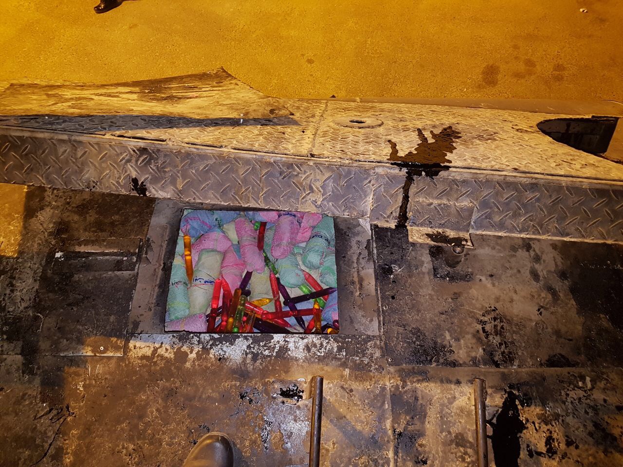 وبتفتيش التانكي، تبيّن أنه مجزأ إلى ثلاثة أجزاء، إلاّ أنّ الجزء الأخير كان مفصولاً عن القار، ووجد بداخله عدد ( 454 ) حزمة من نبات القات المحظور كان بمخبأ سري ومغطى بصاجٍ حديدي من الخارج ومثبت بمسامير كبس المنيوم.