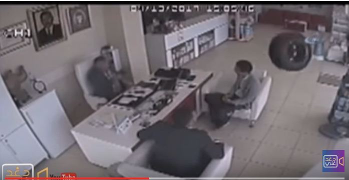 ويوضح الفيديو وجود ثلاثة أشخاص داخل الشركة، أثناء اجتماع عمل، إلا أن الإطار الطائش اقتحم عليهم اجتماعهم ليصيب أحدهم في رأسه.