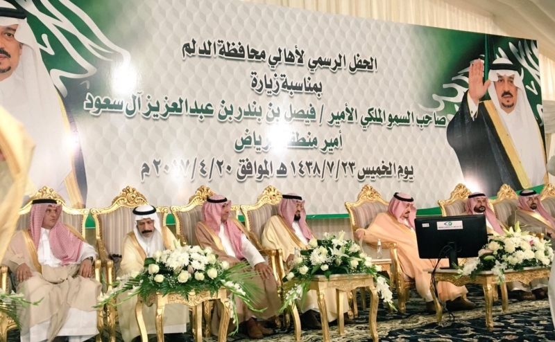 عقب ذلك، حضر الأمير حفل أهالي المحافظة، والاستقبال الذي أقيم في متنزه الضاحي، الذي استُهِلَّ بتلاوة آيات من الذكر الحكيم، ثم رحب رئيس مركز الدلم بزيارة أمير الرياض لتلمس احتياجات محافظة الدلم، تلاها كلمة الأهالي، التي ألقاها الشيخ سعد بن غنيم، مرحبًا فيها بسمو أمير الرياض، ثم قصيدة شعرية للشاعر سعد بن غنام القريني، بعدها شاهد الجميع فيلمًا وثائقيًا عن محافظة الدلم.