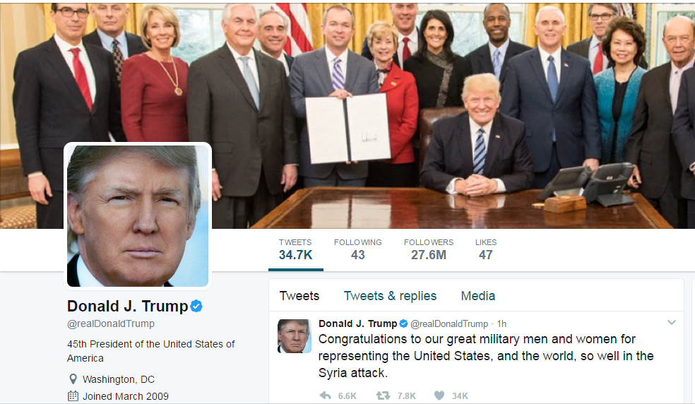 وقال الرئيس الأميركي في تغريدة عبر حسابه بموقع التدوين القصير “تويتر”: “أقدم التهاني لرجال ونساء جيشنا، على تمثيل الولايات المتحدة والعالم بشكل جيد للغاية في هجوم سوريا”.