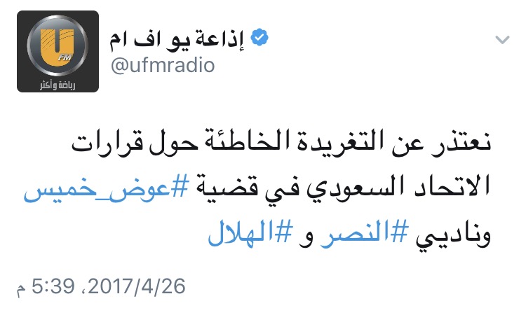 استفزت إذاعة UFM جماهير النصر عقب تغريدة مغلوطة بثّتها عبر حسابها بتويتر، حول اللاعب النصراوي عوض خميس، إلا أنها تداركت الوضع وسارعت بالإعتذار.