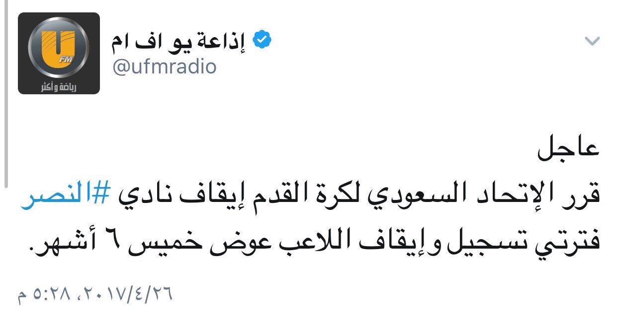 وغرّد حساب الإذاعة، بأنه تم إيقاف نادي النصر فترتي تسجيل، إضافة لإيقاف اللاعب عوض خميس 6 أشهر، مبينةً أنّ القرار صدر من الاتحاد السعودي.