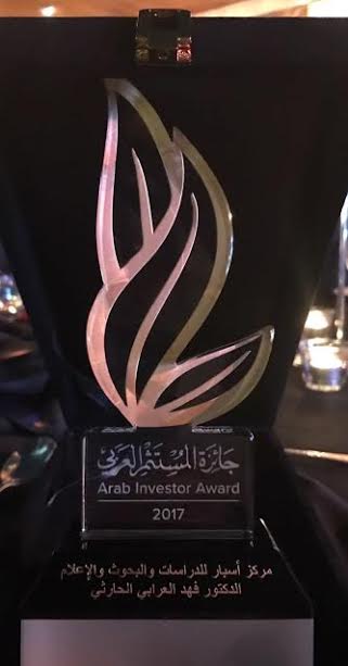 شهدت فعاليات الدورة السابعة لملتقى الاستثمار السنوي (AIM 2017)، في دبي، تكريم الدكتور فهد العرابي الحارثي رئيس مركز أسبار للدراسات والبحوث والإعلام، ضمن عدد من المؤسسات والشركات المتميزة حول العالم لإسهاماتهم الإيجابية في دعم الاقتصاد الوطني وإسعاد المجتمع.
