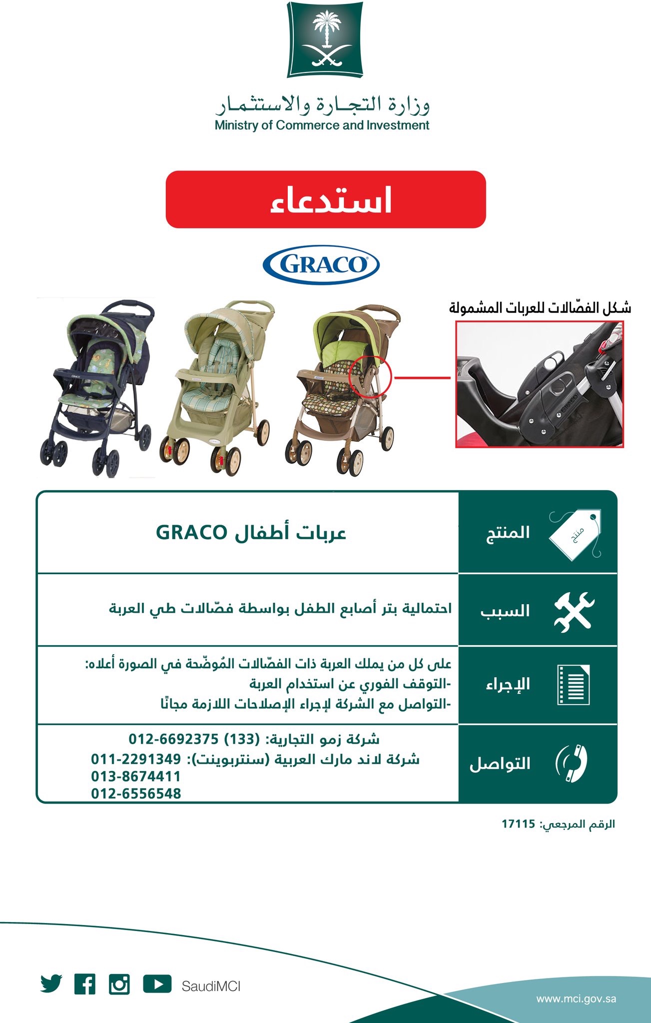 حذّرت وزارة التجارة والاستثمار من استخدام عربات أطفال “GRACO”، لاحتمال تسببها ببتر أصابع الطفل، بواسطة فصالات طي العربة.