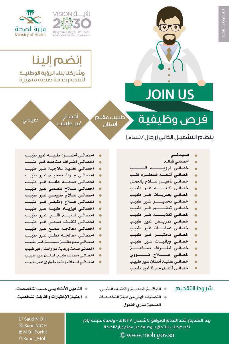 أعلنت وزارة الصحة، عبر حسابها الرسمي بتويتر، عن توفّر وظائف صحية شاغرة للسعوديين (رجال، ونساء)، على نظام التشغيل الذاتي، في تخصصات: “طبيب مقيم أسنان، وأخصائي غير طبيب، وصيدلي”، وفق الشروط التالية: