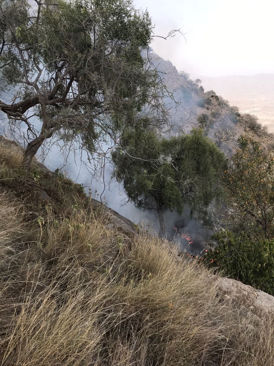 باشر الدفاع المدني في منطقة عسير، حريق شبّ في بعض الأشجار والأعشاب بجزء من جبل أثرب شرقي بارق.