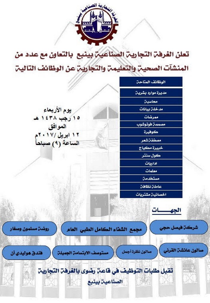 وأوضحت الغرفة أنّه سوف يتم استقبال طلبات التوظيف في قاعة رضوى بمقر الغرفة التجارية الصناعية بينبع، وذلك يوم الأربعاء 15 رجب 1438هـ الموافق 12 أبريل(نيسان) 2017م، عند الساعة التاسعة صباحًا.