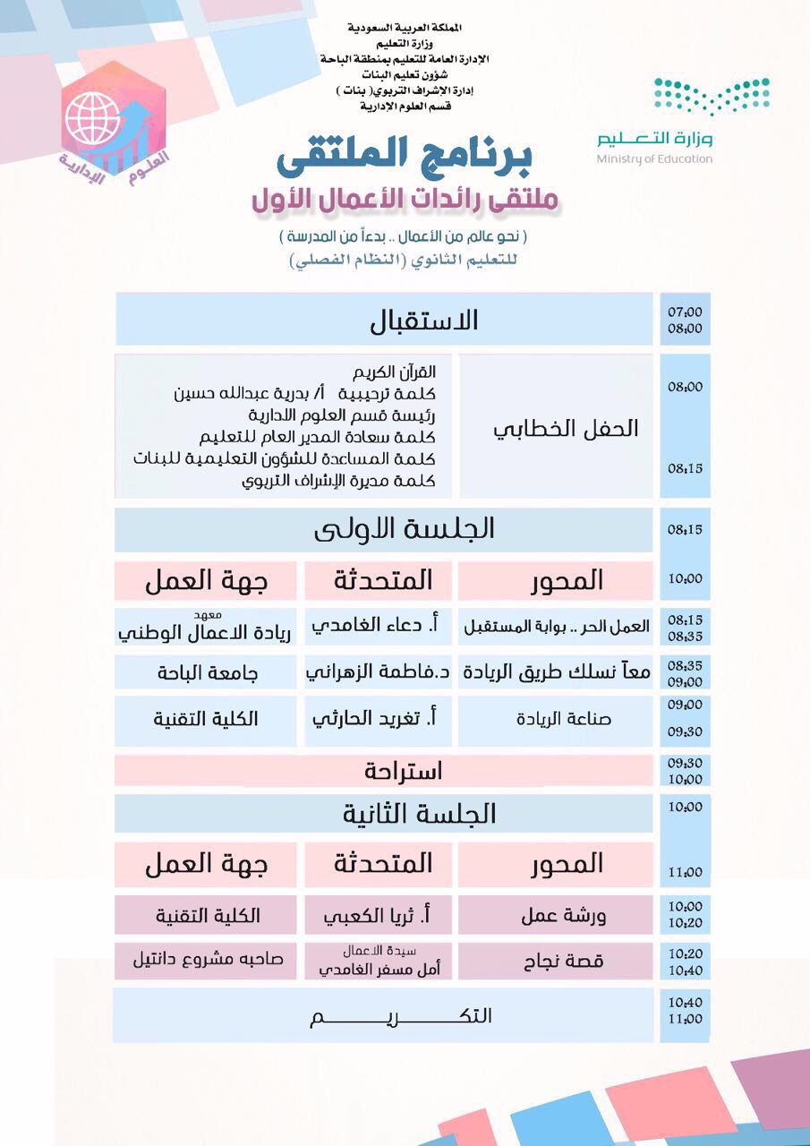 شهد ملتقى رائدات الأعمال الأول لنظام المقررات، والذي أقامته إدارة الإشراف التربوي بتعليم الباحة، فعاليات متنوعة وورش عمل عديدة.