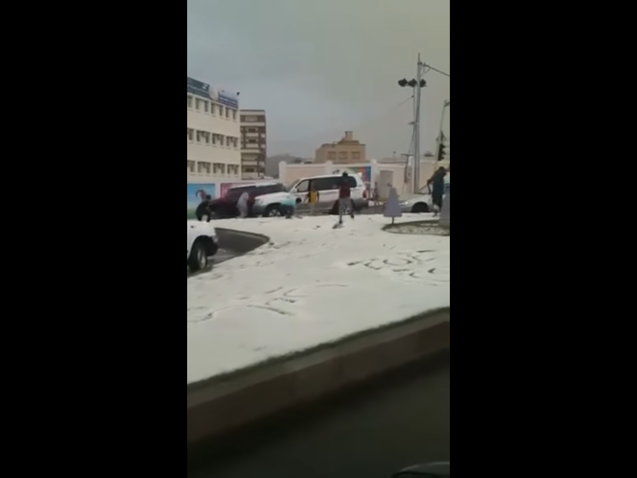 وشُوهد العديد من الشباب يلعبون لعبة كرات الثلج، في استمتاع وبهجة بتساقط الأمطار والبرد.