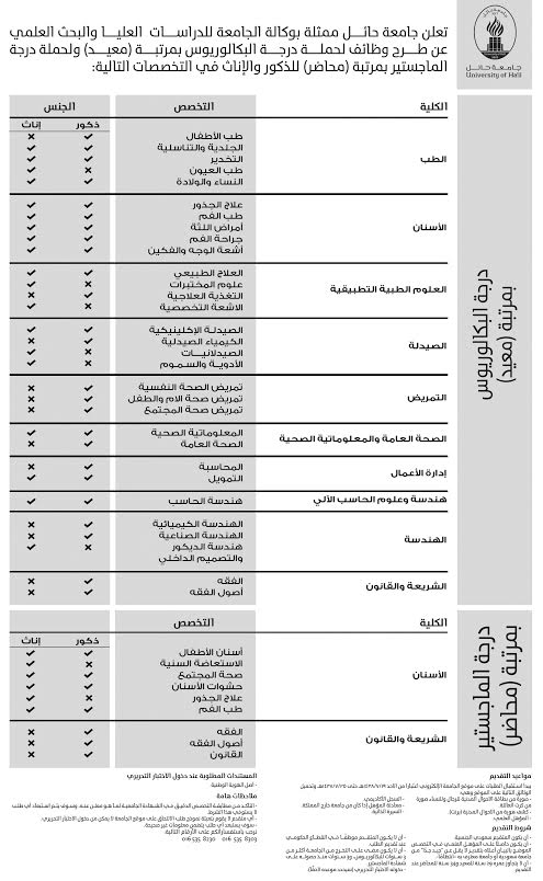 أعلنت جامعة حائل ممثلة بوكالة الدراسات العليا والبحث العلمي الثلاثاء، عن عدد من الوظائف للمعيدين والمحاضرين في عدد من التخصصات.