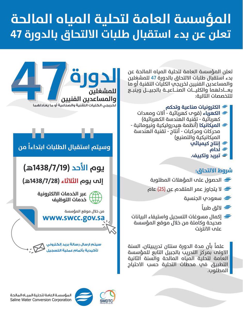 أعلنت المؤسسة العامة لتحلية المياه المالحة عن بدء استقبال طلبات الالتحاق بالدورة 47، للمشغلين والمساعدين الفنيين، لخريجي الكليات التقنية والكليات الصناعية بالجبيل وينبع، أو ما يعادلهما.