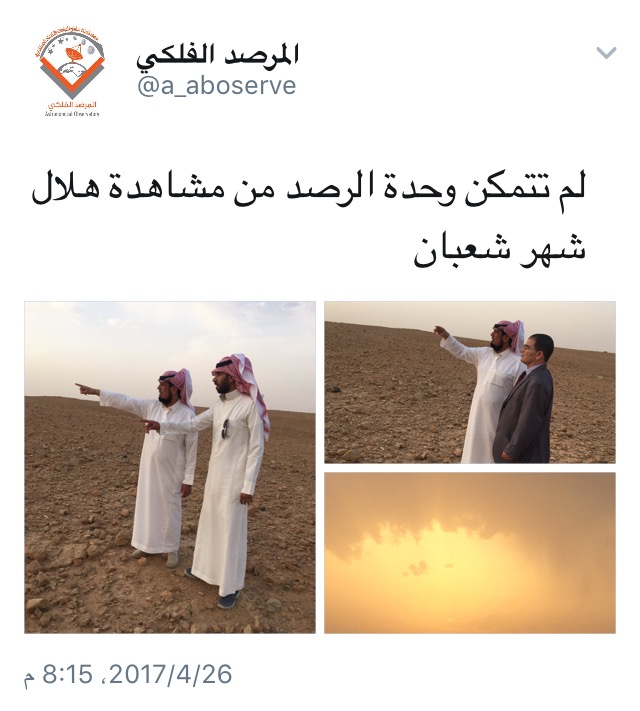 وقال المرصد عبر حسابه الرسمي على موقع التواصل الاجتماعي “تويتر”: “لم تتمكن وحدة الرصد من مشاهدة هلال شهر شعبان”.