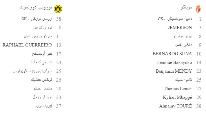 فيما جاءت تشكيلة موناكو للمباراة: “سوباسيتش ، توري ، جليك ، جيميرسون ، ميندي ، سيلفا ، باكايوكو ، موتينهو ، ليمار ، مبابي ، فالكاو”.