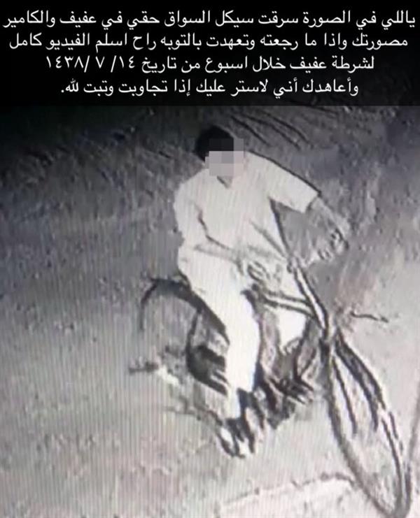 أعطى مواطن بمحافظة عفيف لصاً سرق دراجة هوائية مهلة لمدة أسبوع ليعيدها إليه، وإلا سيتقدم ببلاغ ضده إلى الشرطة، ويفضحه في مواقع التواصل الاجتماعي.