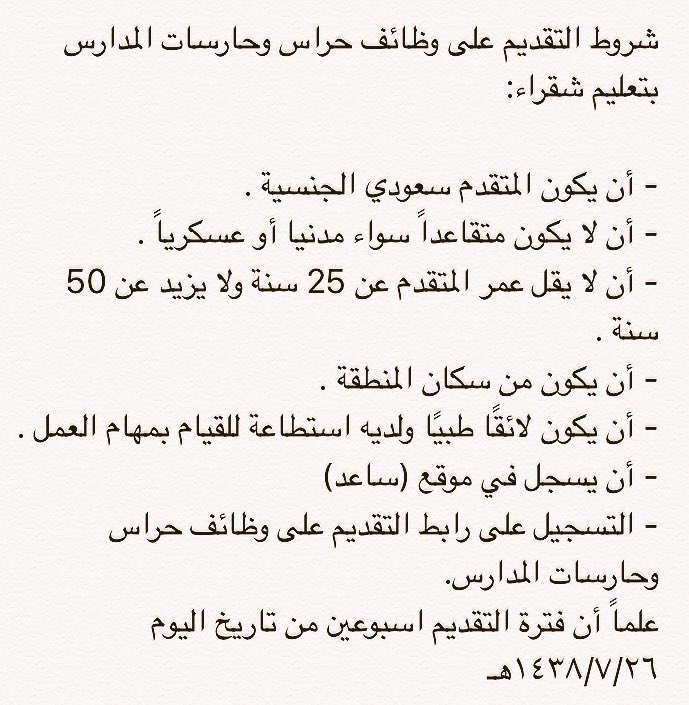 ودعت الإدارة الراغبين والراغبات بالتقديم على وظائف حراس وحارسات المدارس تعبئة بيانات نموذج طلب التوظيف، وذلك عبر الرابط التالي: (هنا ).