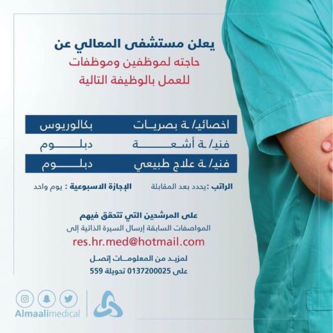 أعلن مستشفى المعالي بمحافظة حفر الباطن عن حاجته لموظفين وموظفات للعمل لديه بالمستشفى، وفقا للوظائف والمؤهلات التالية:
