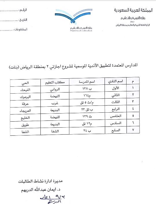 اعتمد المدير العام للتعليم بمنطقة الرياض الدكتور عبدالله بن محمد المانع إطلاق 7 أندية موسمية للطالبات خلال الإجازة الصيفية للاستفادة مما تقدمه الأندية من برامج وفعاليات متعددة وهادفة.