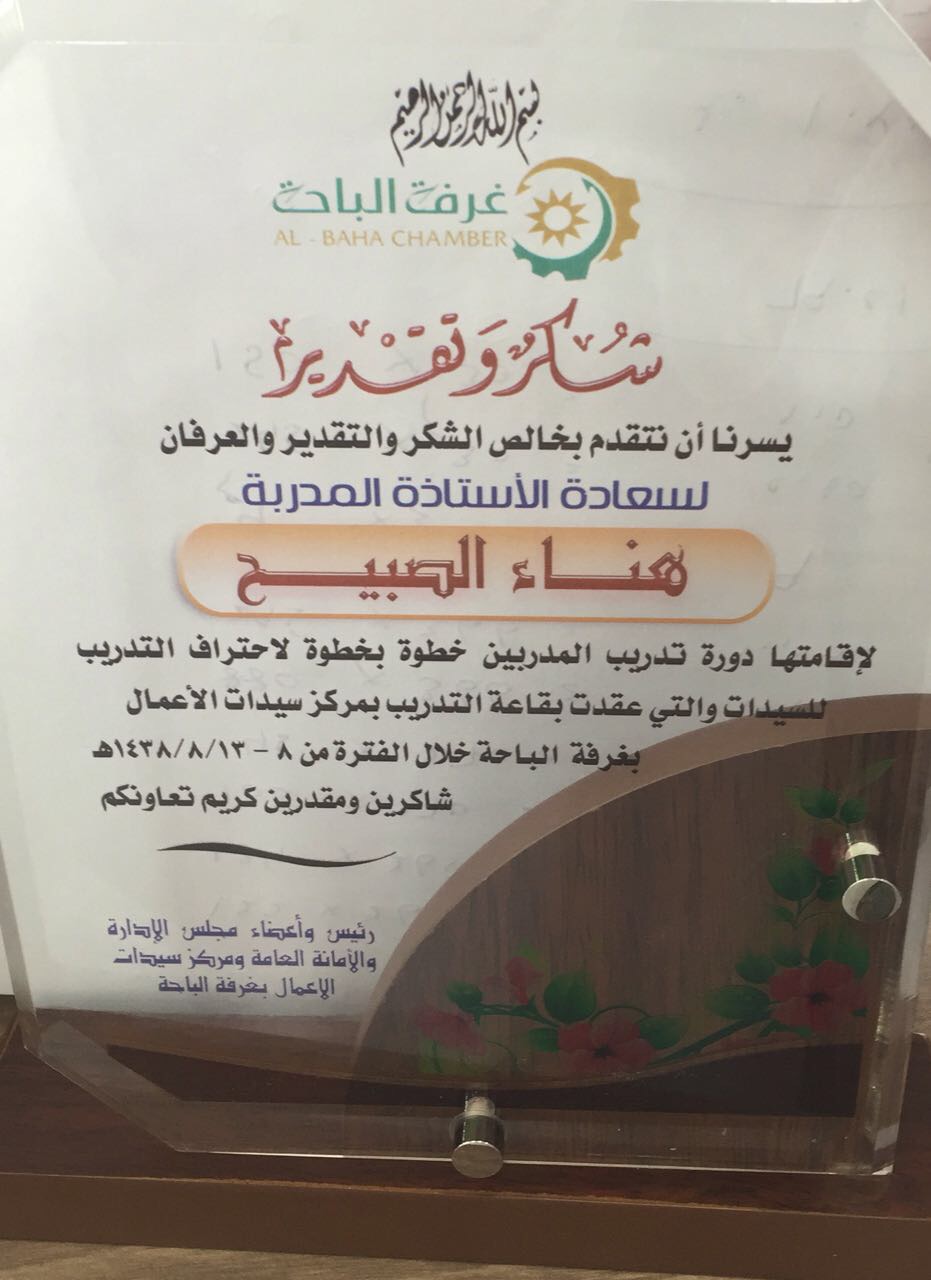 وفي نهاية أيام التدريب قدمت “الزهراني” شهادة شكر وتقدير ودرعاً تذكارياً من رئيس وأعضاء مجلس الإدارة والأمين العام للأستاذة هناء الصبيح، وقدمت شكرها لجميع المتدربات على حضورهن وتفاعلهن مع الدورة من تطبيق نظري وعملي مع تقديم نماذج منهن على كيفية البدء في البرنامج التدريبي.
