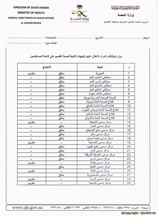 أعلنت المديرية العامة للشؤون الصحية بمنطقة القصيم، ممثلة بإدارة الموارد البشرية، عن توفر وظائف شاغرة بمسمى (سائق، وحارس)، بالجهات التابعة لصحة القصيم.