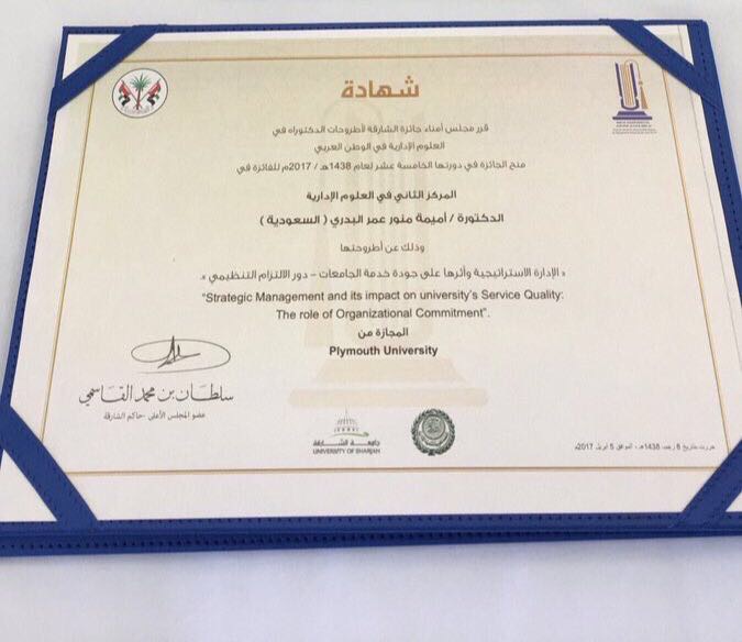 وتأتي الجائزة من المنظمة العربية للتنمية الإدارية التابعة لجامعة الدول العربية، بالتعاون مع جامعة الشارقة، إذ تم تكريم البدري من قبل سمو الشيخ الدكتور سلطان بن محمد القاسمي، تقديراً لجهودها في مجال البحث العلمي.