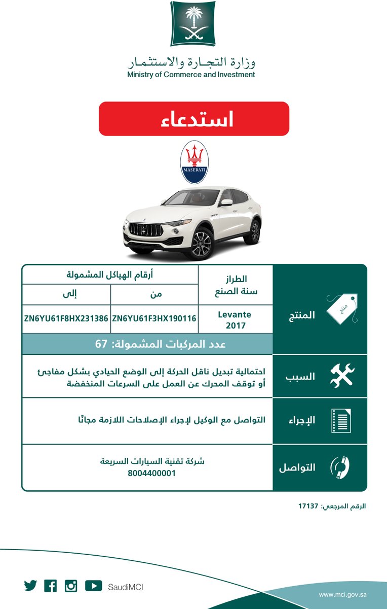 وقالت التجارة عبر حسابها على “تويتر”: “استدعاء مركبات مازيراتي (Levante – 2017)، لاحتمالية تبديل القير إلى الوضع الحيادي أو توقف المحرك عن السرعات المنخفضة”.