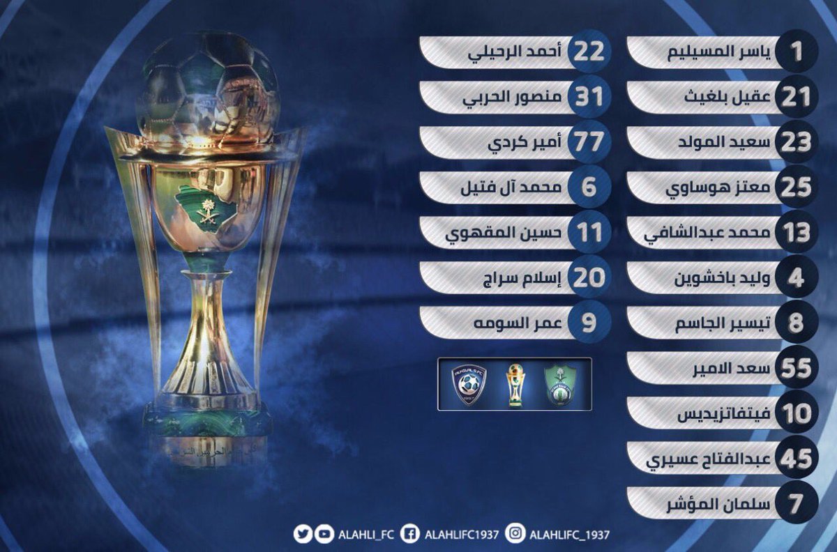 ويلعب الأهلي بالتشكيلة التالية: ياسر المسيليم في حراسة المرمى ـ خط الدفاع  محمد عبد الشافي وعقيل بلغيث ومعتز هوساوي وسعيد المولد  ـ خط الوسط وليد باخشوين وسعد الأمير وتيسير الجاسم وفيتفا وعبدالفتاح عسيري ـ وفي المقدمة سلمان المؤشر.