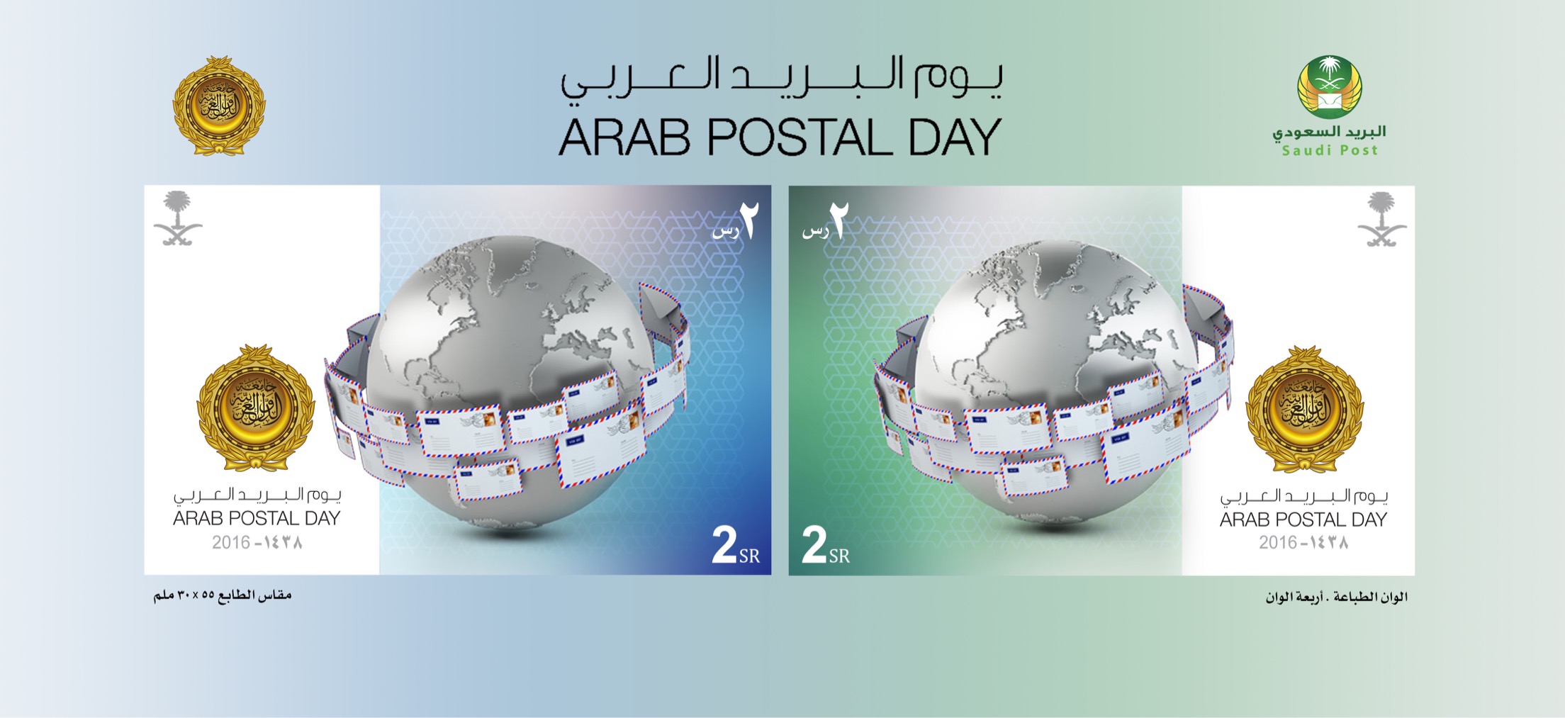 في حين تضمّن الطابع الثاني الكرة الأرضية تحيط بها مجموعة من الرسائل، وكتب عليه عبارة “يوم البريد العربي” بالعربية والإنجليزية، وتضم الصفحة طابعين.