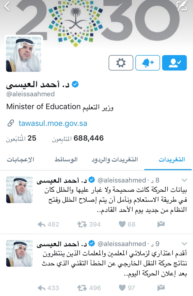 وكان قد سبق هذه التغريدة تغريدة اعتذار العيسى قال فيها: “أقدم اعتذاري لزملائي المعلمين والمعلمات الذين ينتظرون نتائج حركة النقل الخارجي عن الخطأ التقني الذي حدث بعد إعلان الحركة اليوم”.