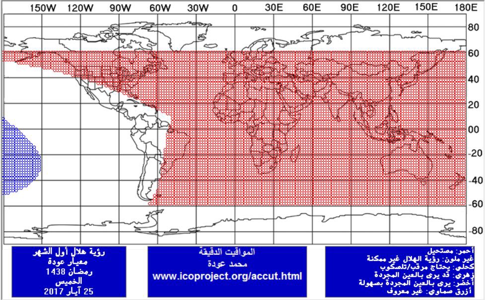 وأوضح مدير المركز الدولي للفلك المهندس محمد عوده أن، بعض الدول الإسلامية ستتحرى هلال شهر رمضان 1438هـ يوم الخميس 25 مايو، وفي ذلك اليوم سيغيب القمر قبل غروب الشمس في جميع الدول الإسلامية، مما يجعل رؤية الهلال في ذلك اليوم مستحيلة من جميع مناطق العالم الإسلامي، في حين ستتحرى معظم الدول الإسلامية هلال شهر رمضان يوم الجمعة 26 مايو لأنه الموافق لليوم التاسع والعشرين من شهر شعبان، وستكون رؤية هلال شهر رمضان ممكنة بالعين المجردة يوم الجمعة من الأميركيتين ومن جنوب وغرب قارة أفريقيا وهذا يشمل السودان والصومال وموريتانيا والمملكة المغربية وأجزاء من الجزائر، في حين ستكون رؤية الهلال ممكنة بالعين المجردة بصعوبة من بقية الدول العربية ومن جنوب شرق آسيا.