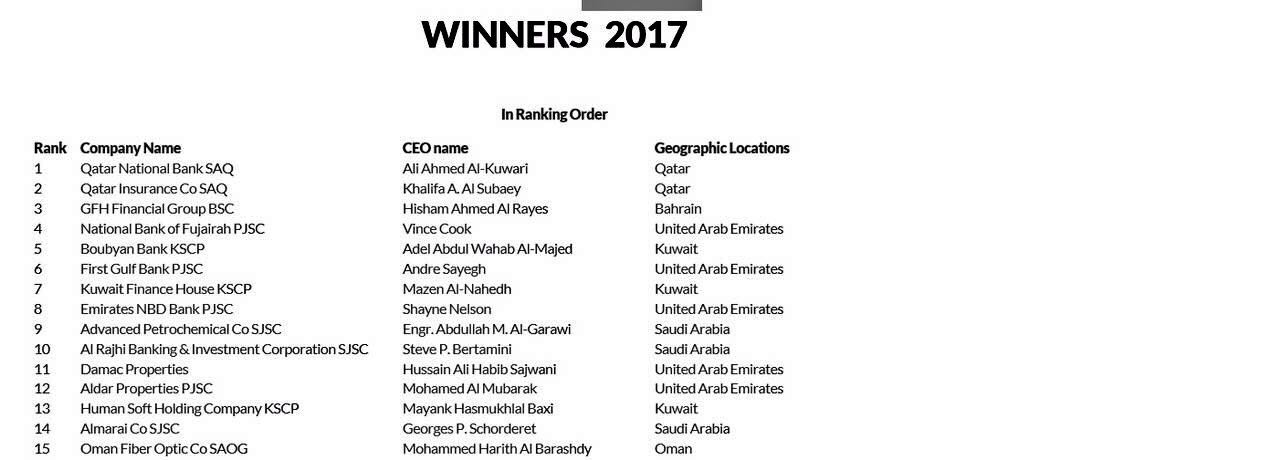 وتم الاحتفال باختيار 100 رئيس ومدير تنفيذي في المنطقة الخليجية، على أساس تقييم قوائم شركاتهم في البورصات الخليجية عبر مختلف الفئات في عملية دقيقة وشفافة.