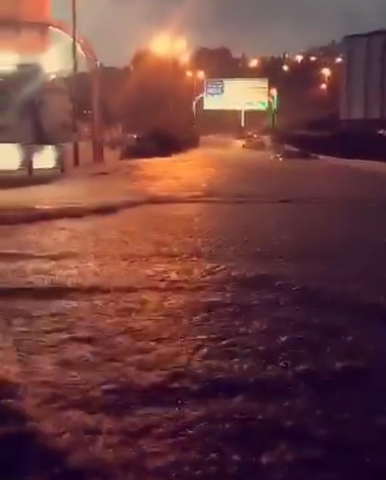 وتجمعت المياه في مواقع عدة بشكلٍ كبير، تخطت أرصفة الجزيرة الوسطية وأصبحت معها جميع مسارات الشارع مسارًا واحدًا،