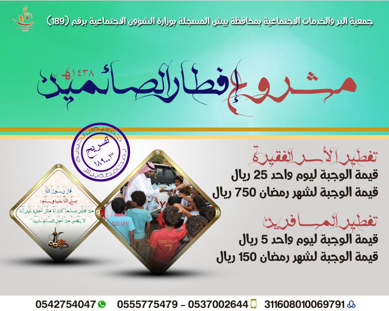 ويهدف المشروع إلى توزيع وجبات إفطار يومية لـ200 أسرة من الأسر الواقعة في نطاق عمل الجمعية طيلة شهر رمضان، كما يشهد المشروع على توزيع 12.600 وجبة إفطار خلال الشهر الفضيل، بمعدل 250 وجبة يوميًّا للمسافرين على الطريق الدولي.