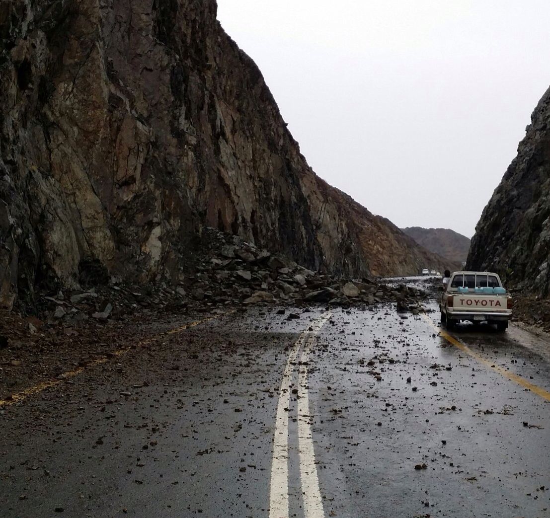 تسببت الأمطار الغزيرة التي هطلت على محافظة العرضيات الكثير من الأضرار، حيث تسببت في إغلاق الطريق الرابط بين محافظتي العرضيات القنفذة (طريق قنونا)، وسط تساقط للصخور من الجبال، وانعدام الطريق.