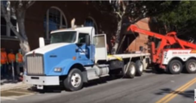 وأظهر مقطع فيديو بثته وكالة أسوشيتيد برس، الشاحنة وهي عالقة، فيما حاولت فرق الإنقاذ سحبها خارج الحفرة.