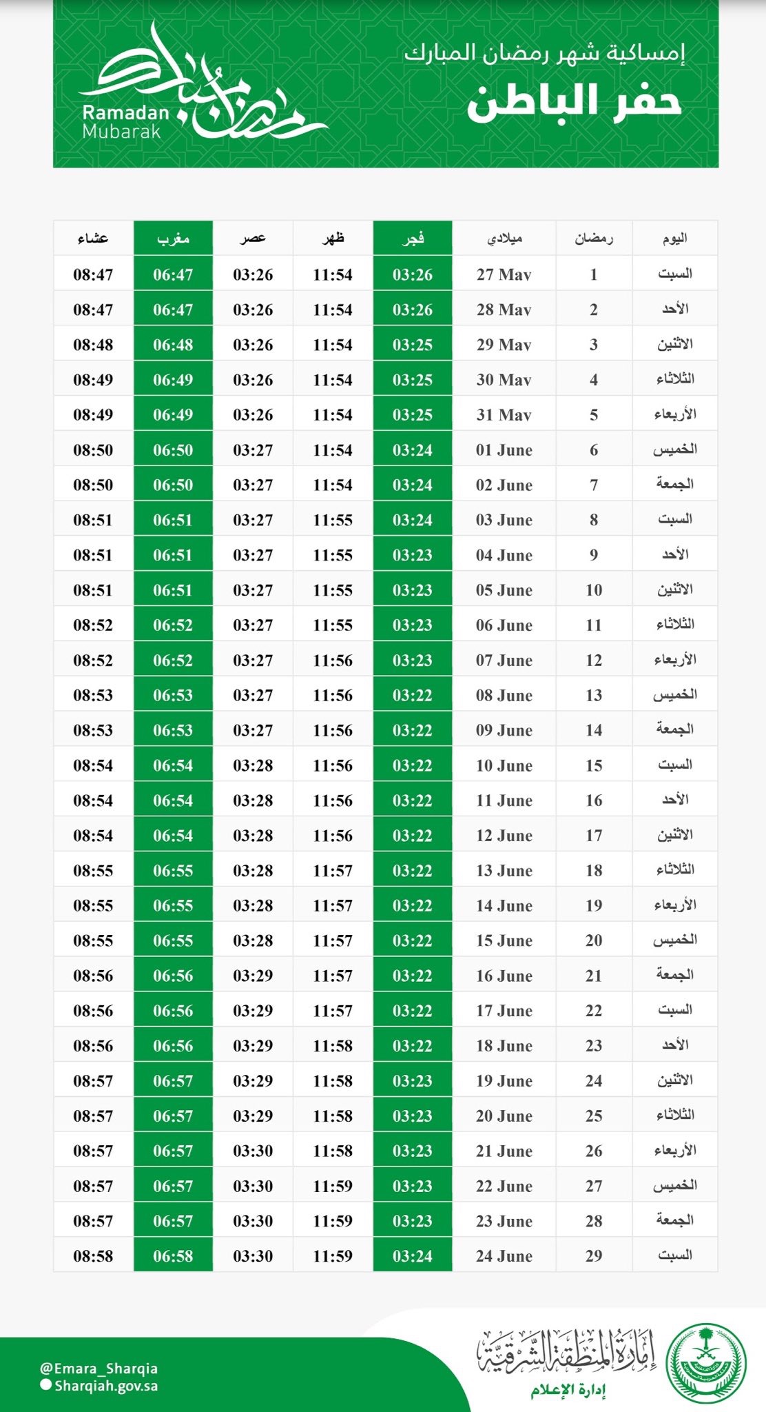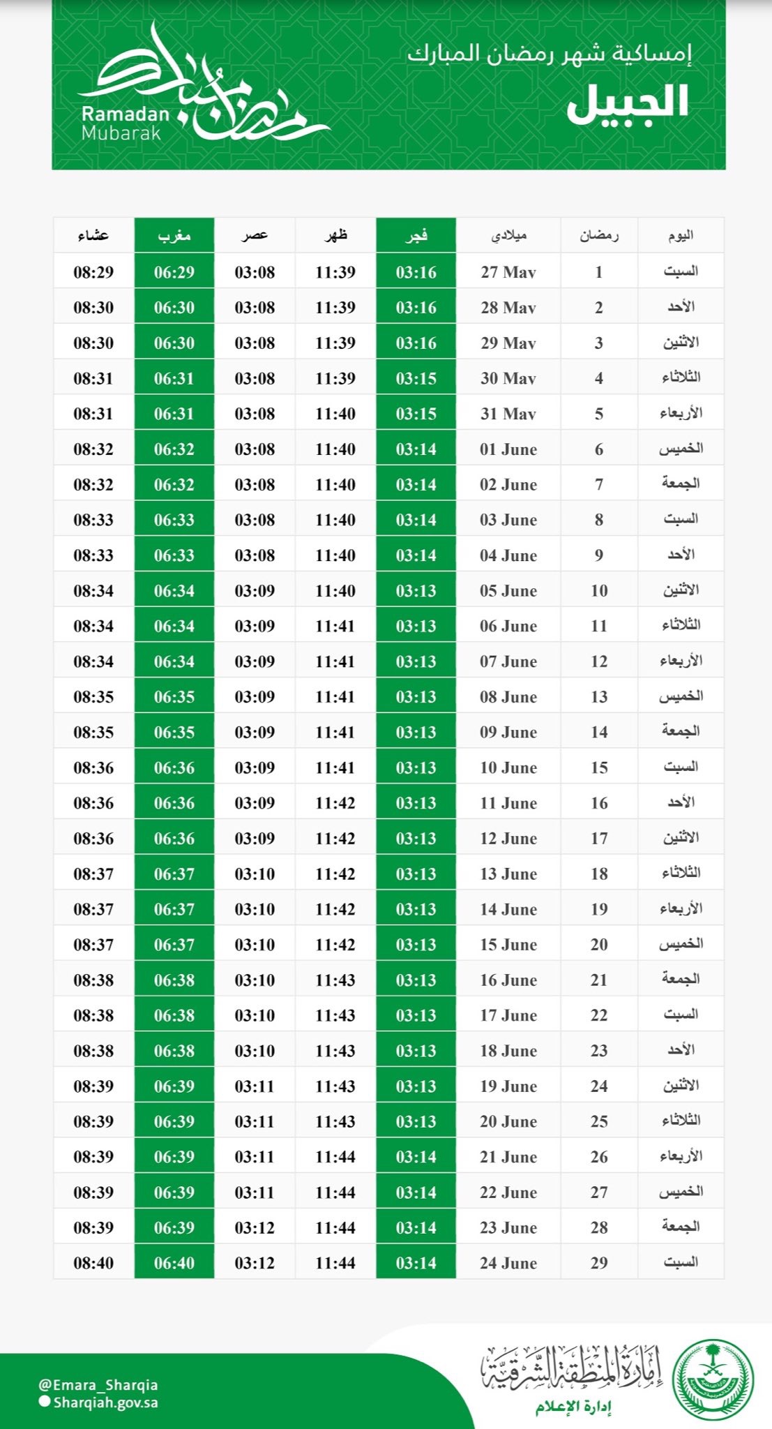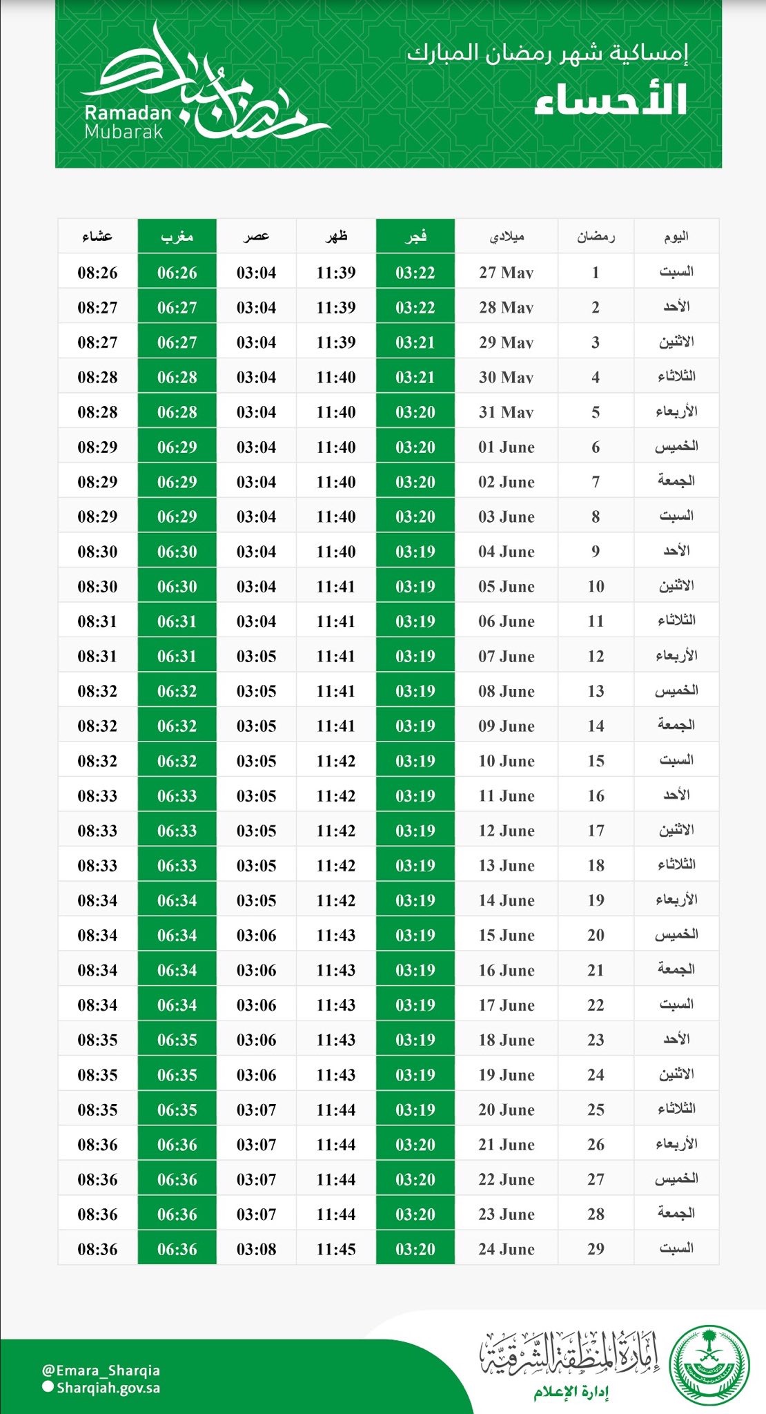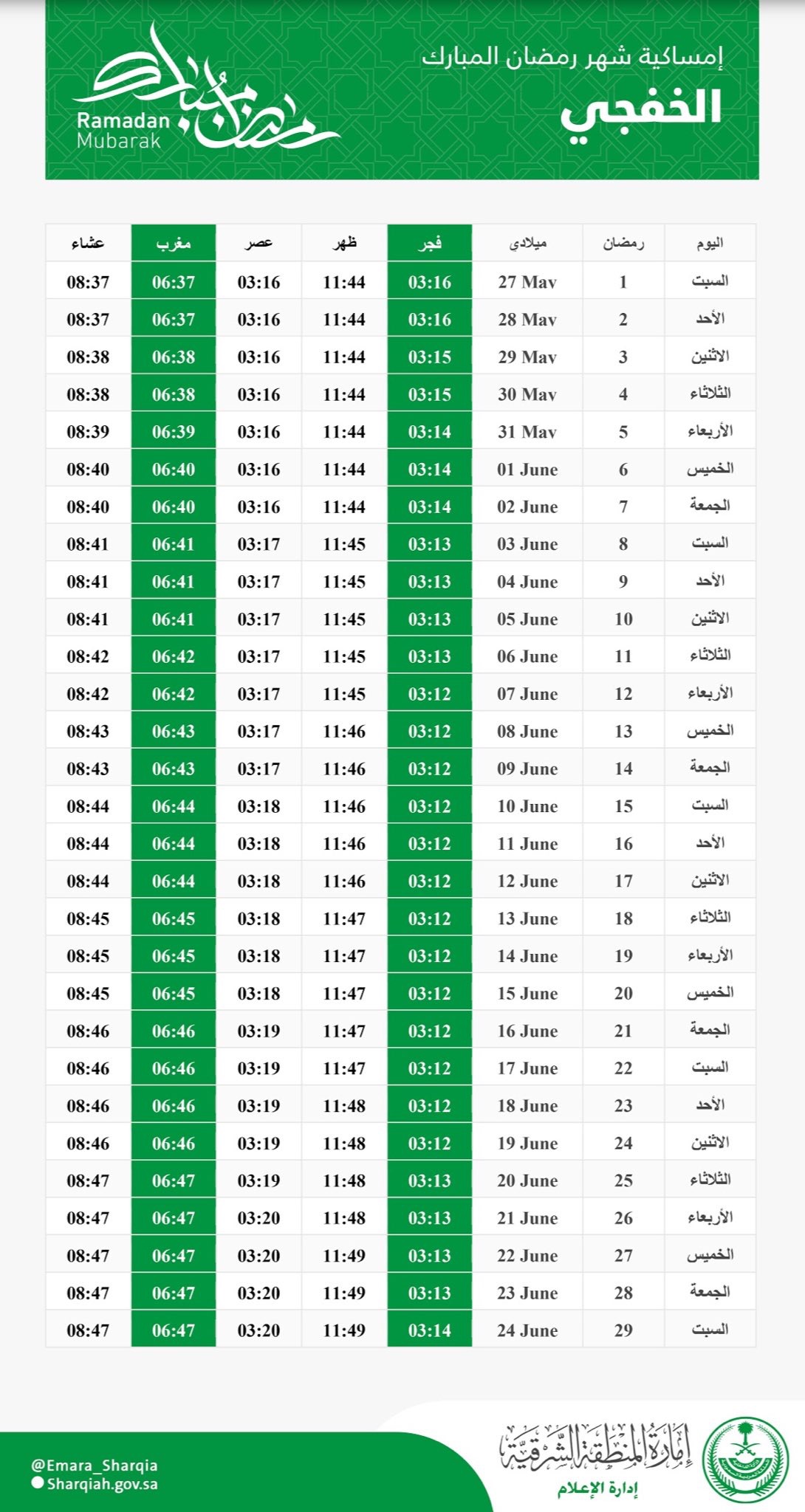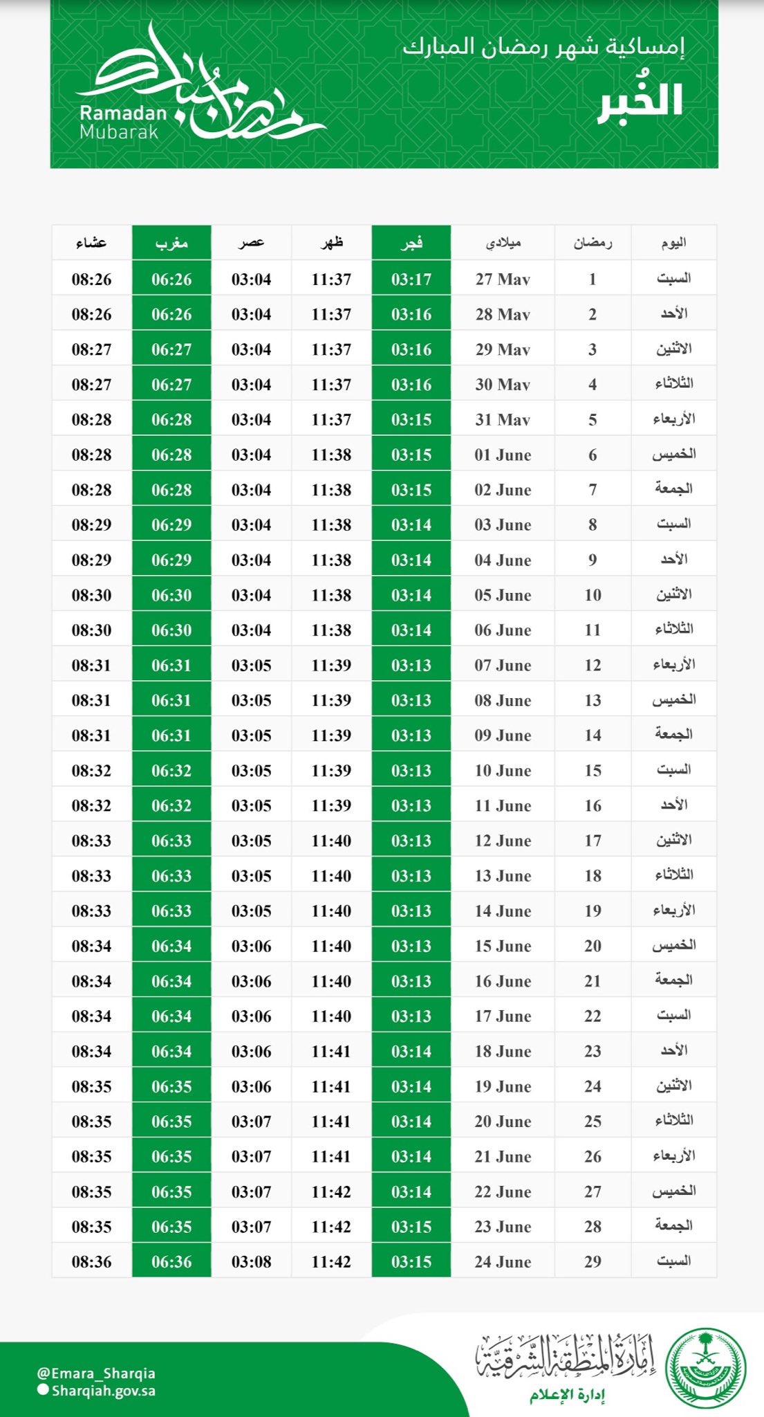 نشرت إمارة المنطقة الشرقية إمساكية شهر رمضان المبارك لمحافظات ومدن المنطقة