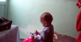وأظهر مقطع الفيديو الطفل وهو يلعب بدمية بلاستيكية على شكل بقرة متخيلاً أنه يقودها وظل يقفز عليها حتى اختل توازنه ليسقط بقوة على الأرض.