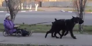 ويظهر من خلال مقطع فيديو متداول امرأة، صنعت زلاجة على 4 عجلات وقام اثنان من الكلاب بسحبها، والتنقل كما تريد.