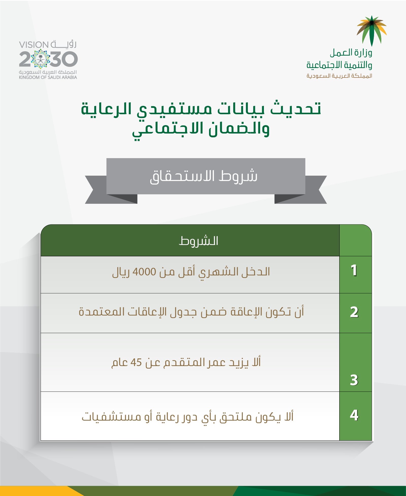واشترطت الوزارة ألا يزيد عمر المتقدم للحصول على إعانات الرعاية الاجتماعية، على 45 عامًا، وألا يزيد راتبه على 4 آلاف ريال، وكذلك أن تكون الإعاقة ضمن جدول الإعاقات المعتمدة، وألا يكون ملتحق بأي دور رعاية أو مستشفيات.