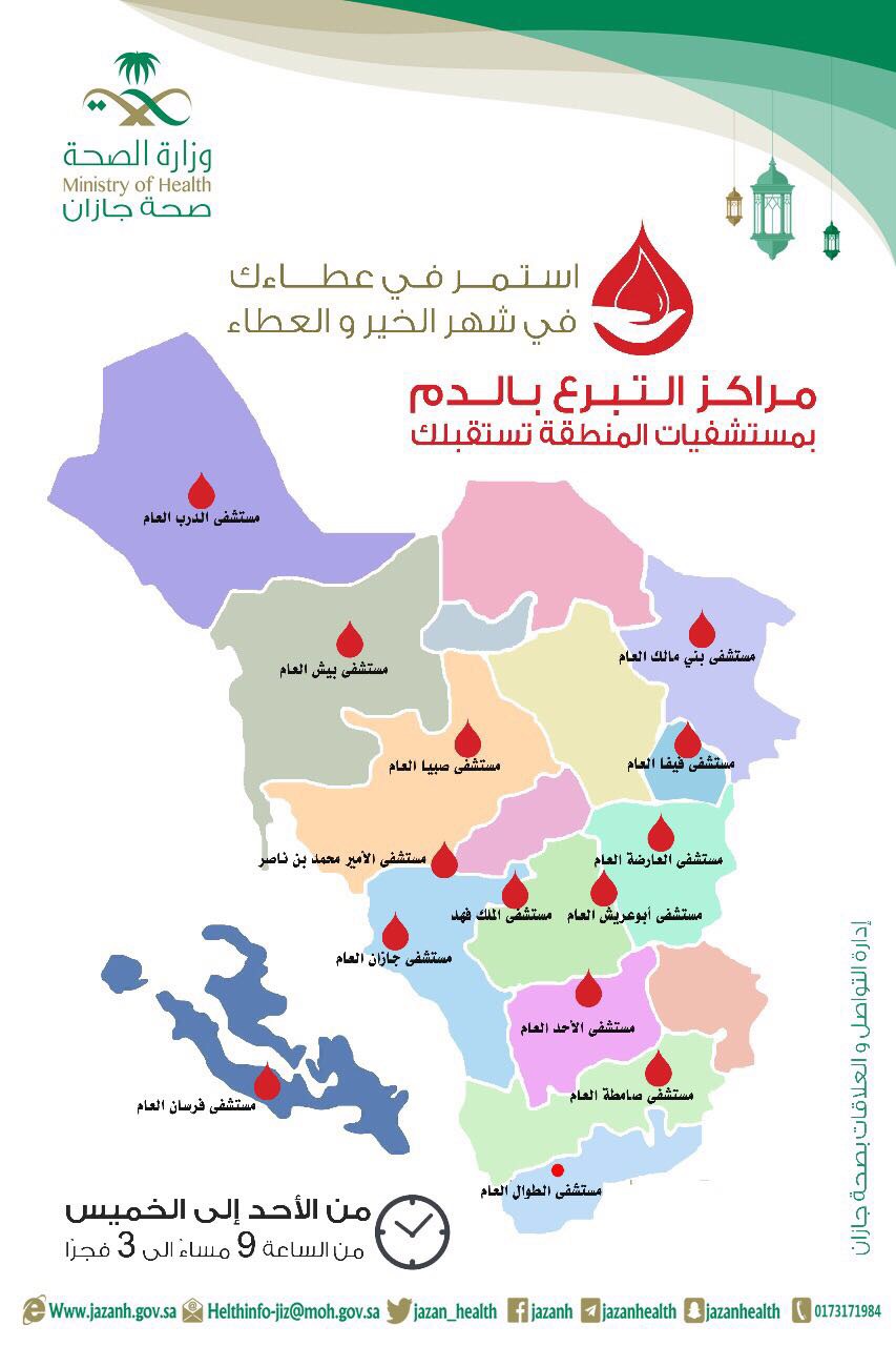 وأخيراً أوضحت صحة جازان بياناً بالمستشفيات التي يتواجد بها مركز للتبرع بالدم على النحو التالي: