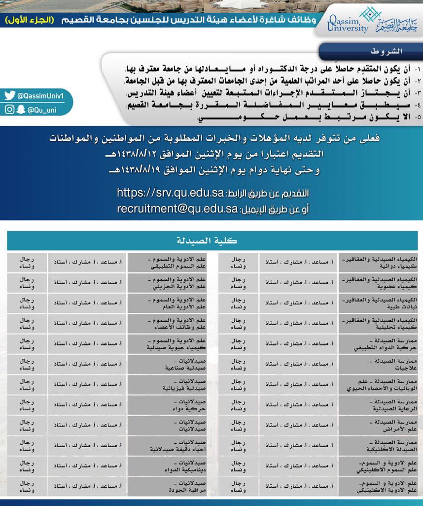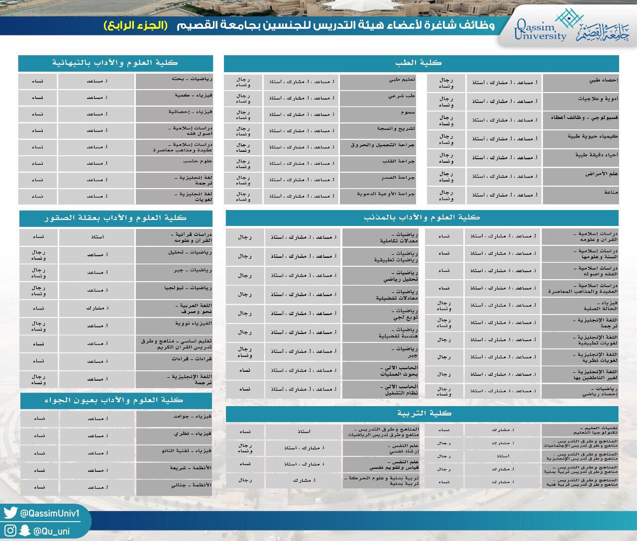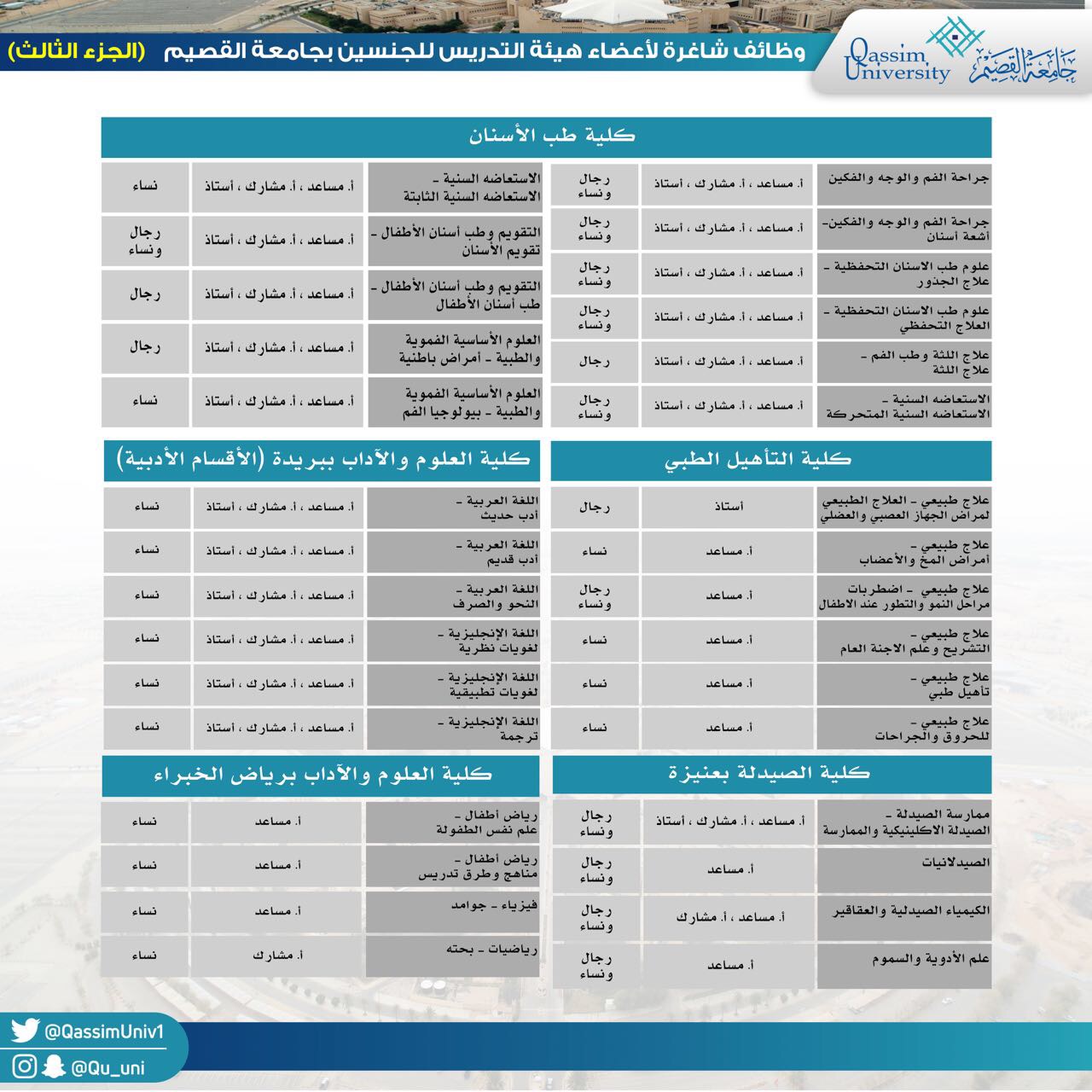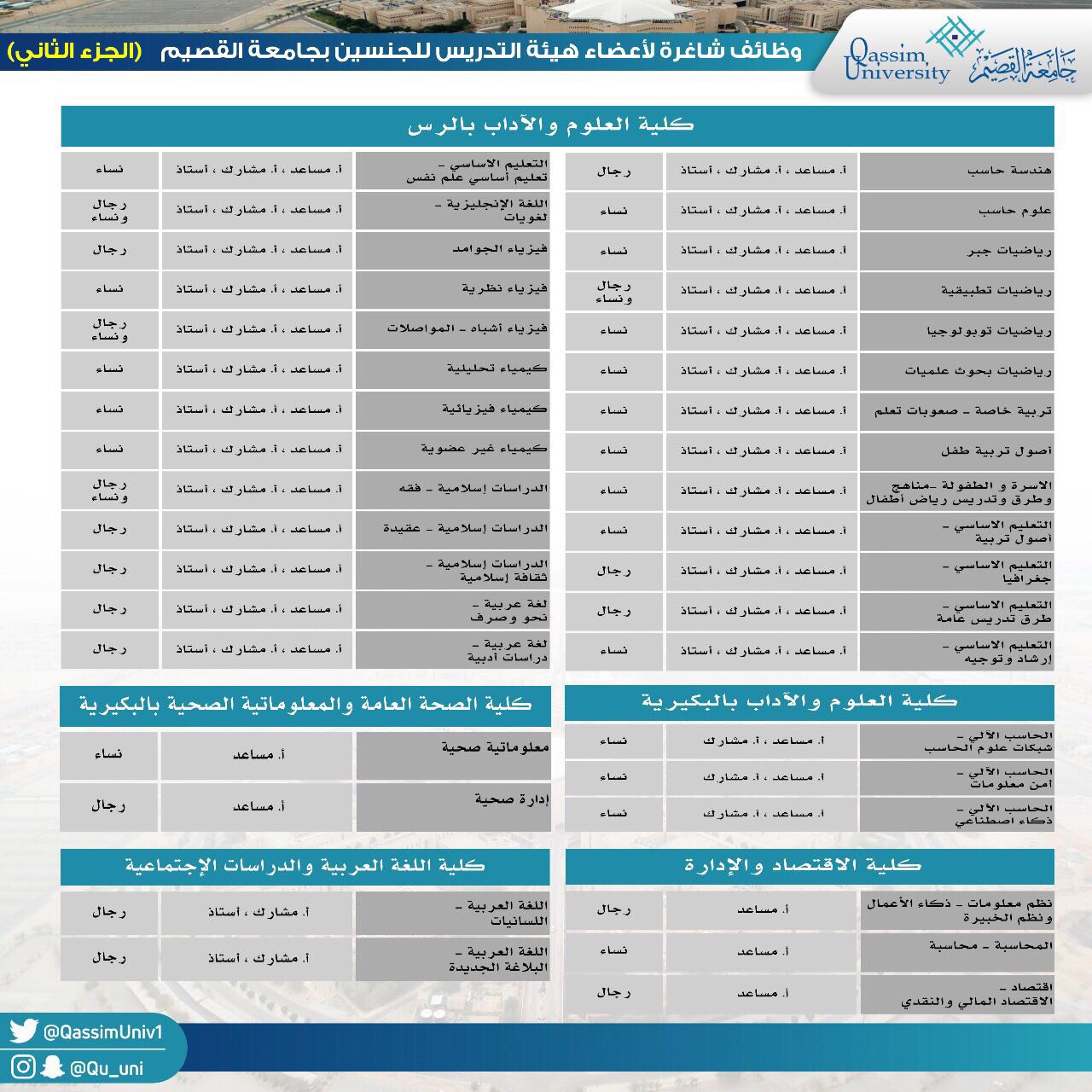 أعلنت جامعة القصيم، عن حاجتها إلى أعضاء هيئة التدريس من الجنسين، في عدد من التخصصات بكليات الجامعة المختلفة.