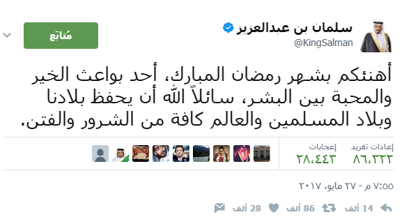 لاقت تغريدة خادم الحرمين الشريفين، الملك سلمان بن عبدالعزيز، عن شهر رمضان المبارك لعام 1438هـ، أكثر ترويجًا وانتشارًا من بين ملوك ورؤساء العالم، بعد أن حصلت على أكثر من 86 ألف إعادة تغريد وأكثر من 28 ألف إعجاب و29 ألف تفضيل لحسابات تويتر و14 ألف رد في أقل من 4 ساعات.