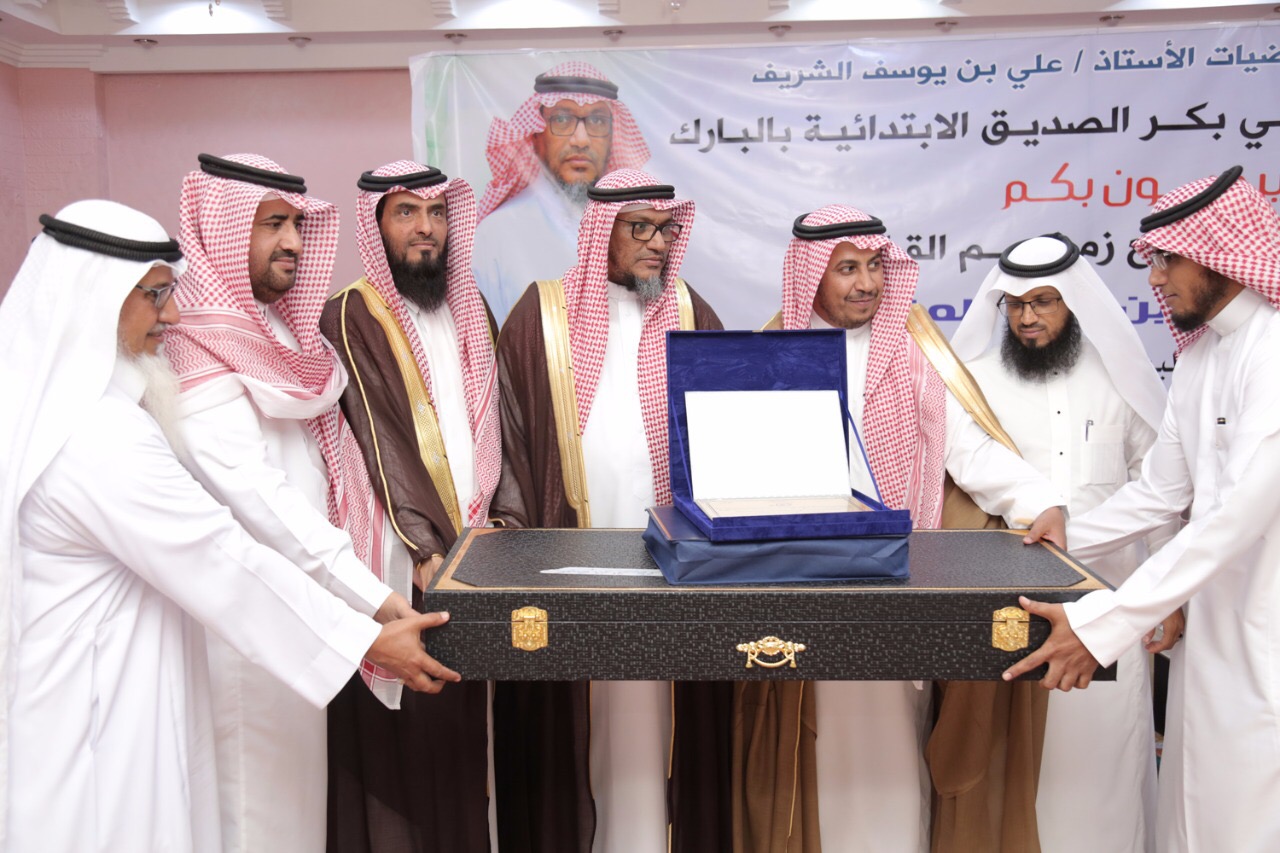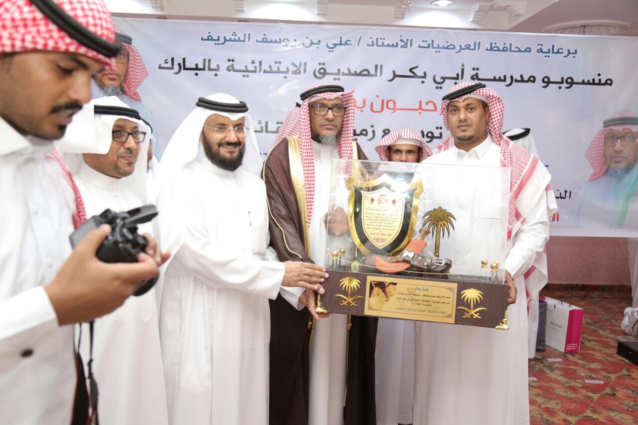 في ليلة من ليالي الوفاء رعى محافظُ العرضيات الأستاذ علي بن يوسف الشريف بقاعة المعالي الاحتفاءَ الذي أقامه منسوبو مدرسة أبي بكر الصديق الابتدائية في البارك بمحافظة العرضيات بمشاركة إخوة المحتفى به والمعلمين السابقين بمناسبة تقاعده المبكر بعد أن أمضى (٣٥) عامًا في ميدان التربية والتعليم معلمًا ورائد نشاط في مدرسة الدار الجديدة بغليلة ثم معلمًا بمدرسة الصفي الابتدائية ثم وكيلًا لمتوسطة نمرة (العز بن عبدالسلام) ثم وكيلاً لثانوية نمرة (الأندلس) ثم قائدًا لابتدائية أبي بكر الصديق رضي الله عنه بالبارك، وذلك بحضور مدير مكتب التعليم بالعرضية الشمالية الأستاذ سعد القرني ، وعدد من المشرفين والمعلمين وقادة المدارس ومديري الإدارات الحكومية والجهات الخيرية ومشائخ القبائل والأهالي والطلاب.