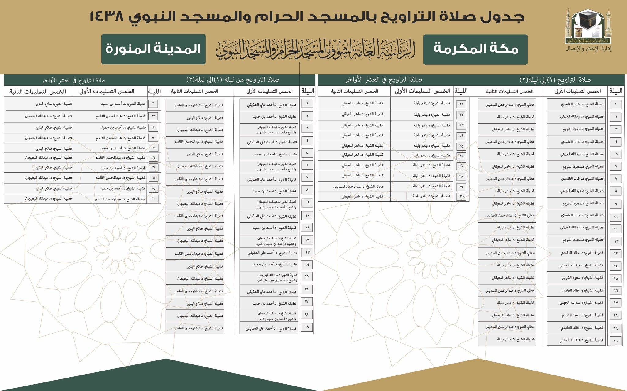 أعلنت الرئاسة العامة لشؤون الحرمين الشريفين جدول صلاة التراويح في ⁧‫المسجد الحرام‬⁩ و⁧‫المسجد النبوي‬⁩ لشهر ⁧‫رمضان‬⁩ المبارك لهذا العام ١٤٣٨ هـ