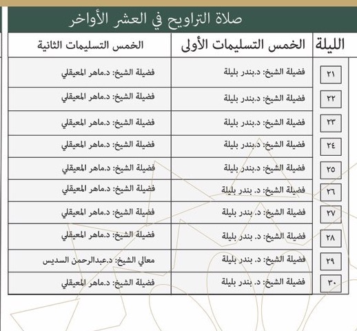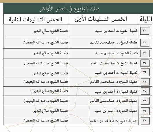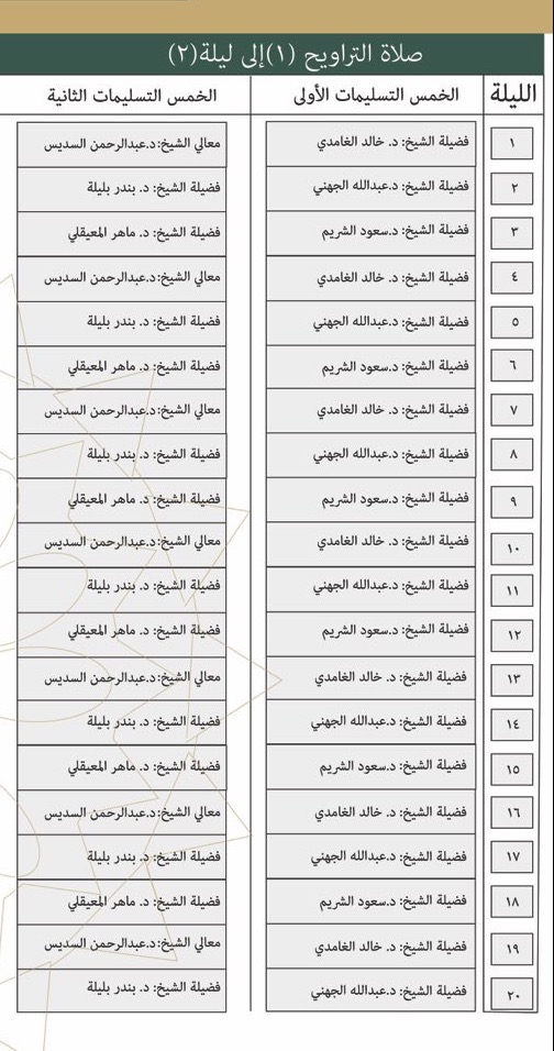 وتضمن الجدول أسماء المشايخ المشاركين في صلاة التراويح.