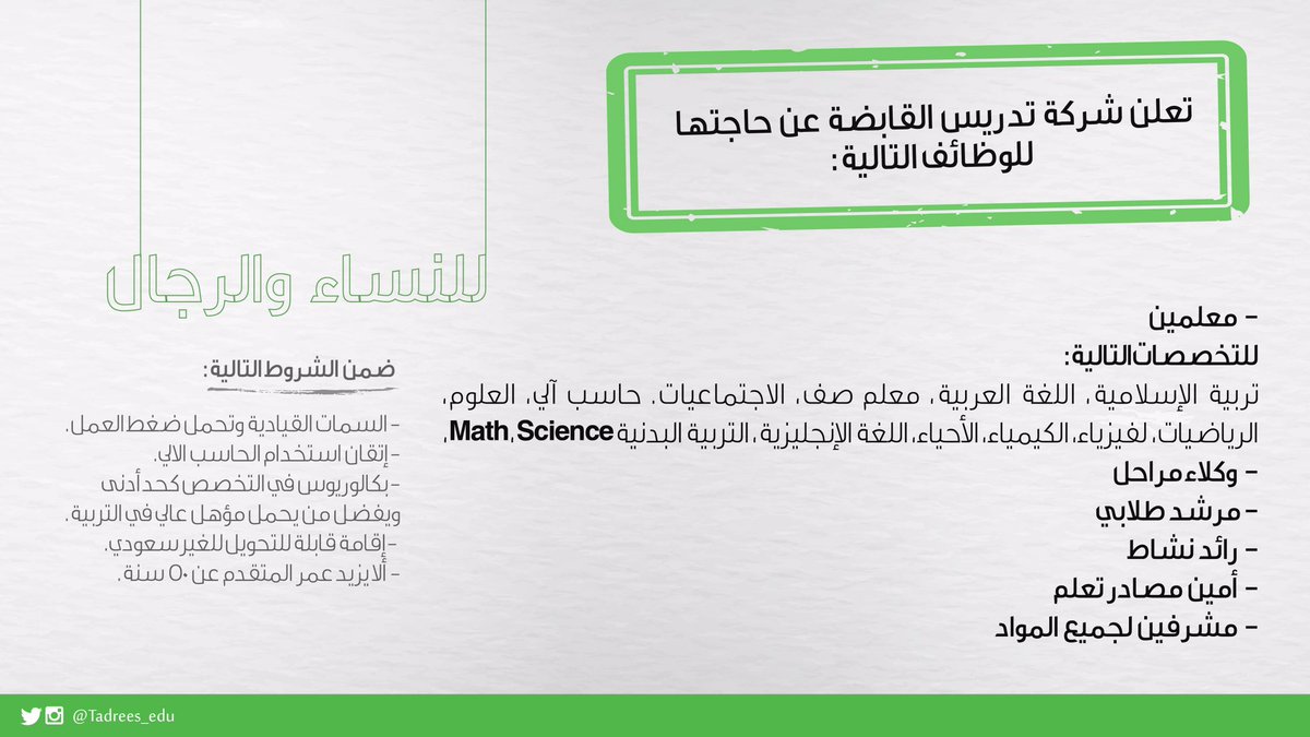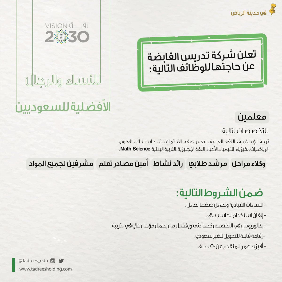 أعلنت شركة تدريس القابضة بمدينة الرياض، عبر موقعها الإلكتروني، عن توفّر وظائف تعليمية وإدارية شاغرة للجنسين، للعمل لدى المدارس التابعة لها في مدينة الرياض.