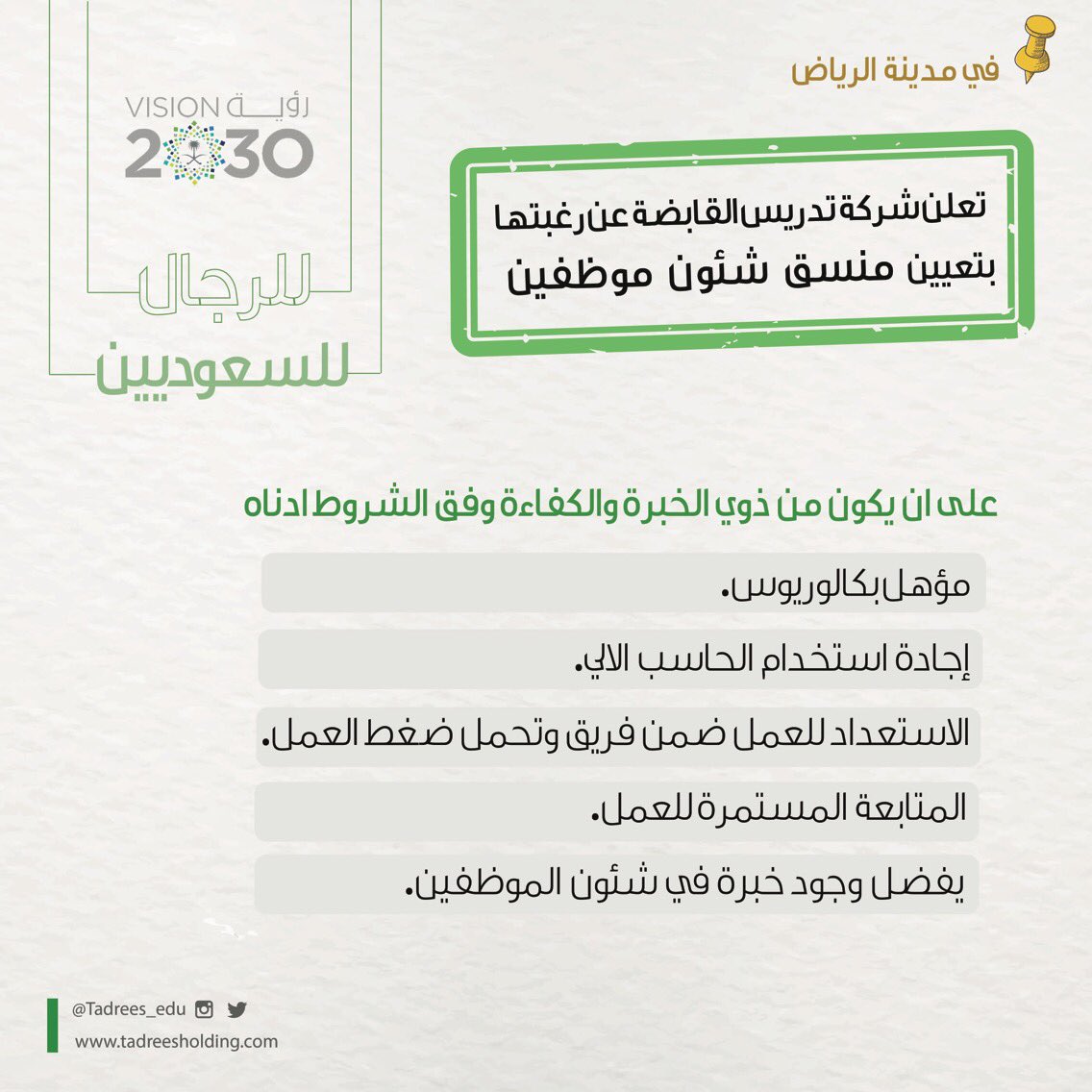 – يفضل وجود خبرة في شؤون الموظفين.