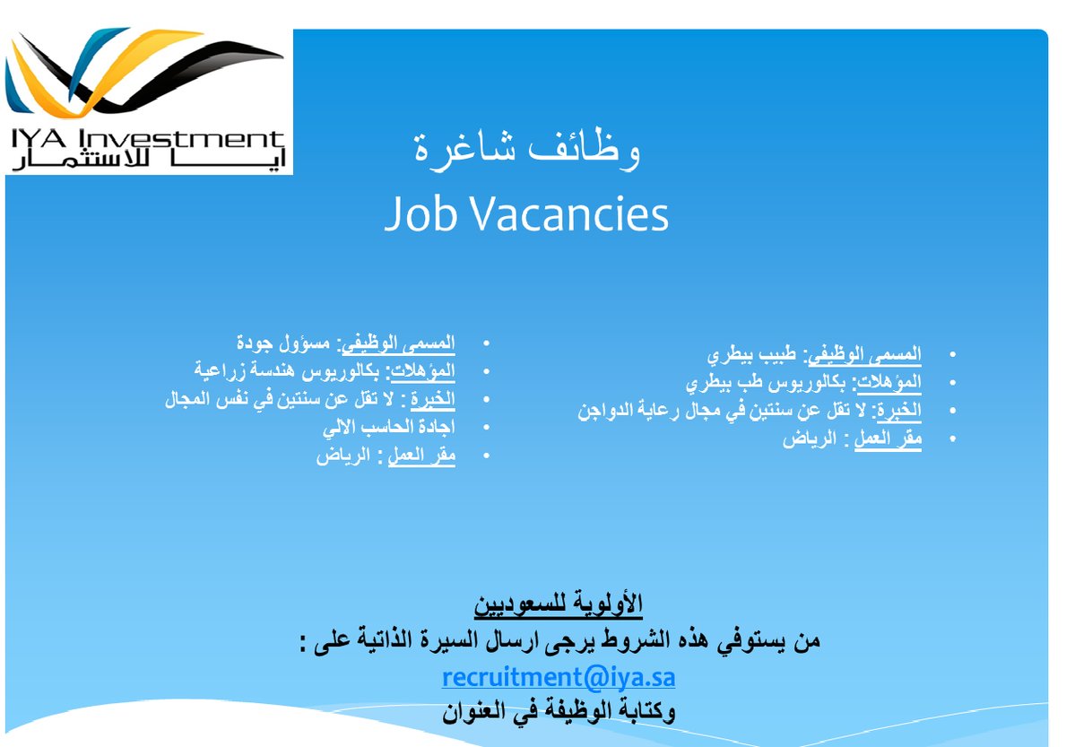 أعلنت مجموعة شركة آيا للاستثمار عن توفّر وظائف صحية وإدارية شاغرة للسعوديين، لحمَلة درجة البكالوريوس، وذلك للعمل بفروعها الشركات التابعة لها في منطقة الرياض.