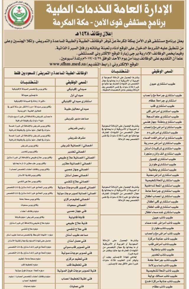 أعلن مستشفى قوى الأمن بمنطقة مكة المكرمة، عبر موقعه الإلكتروني، عن توفّر عدد من الوظائف الطبية، والطبية المساعدة، والتمريض، لكلا الجنسين، لحمَلة شهادات الزمالة، والدكتوراه، والماجستير، البكالوريوس، والدبلوم، وذلك للعمل بمقر المستشفى في مكة المكرمة.