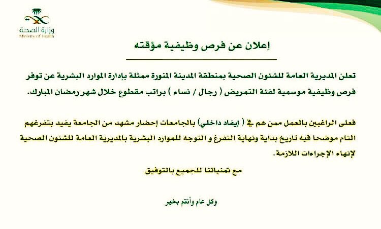 أعلنت المديرية العامة للشؤون الصحية بمنطقة المدينة المنورة- ممثلة بإدارة الموارد البشرية، عن توفّر فرص وظيفية موسمية لفئة التمريض (رجال ونساء)، براتب مقطوع خلال شهر رمضان المبارك، وذلك للعمل في كل من “مستشفى الأنصار، ومركز صحي جبريل، ومركز الصافية، ومركز باب المجيدي، ومركز صحي المطار”.